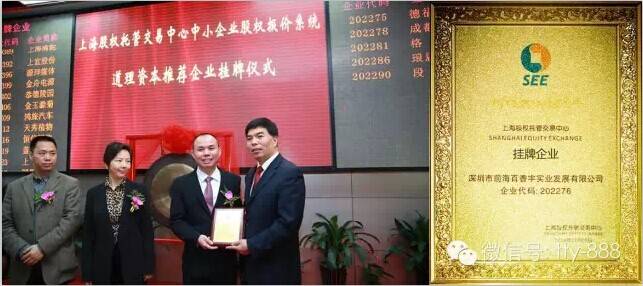 2014年11月5日,深圳市前海百香宇实业发展有限公司在上海股权托管交易中心正式挂牌上市,正式登陆Q版,成了中国首家在上海股交中心挂牌的小吃专业调味品牌企业。
