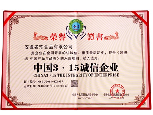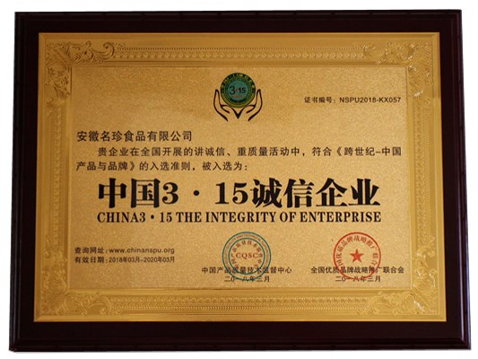 安徽名珍食品有限公司荣获“中国3·15诚信企业”称号