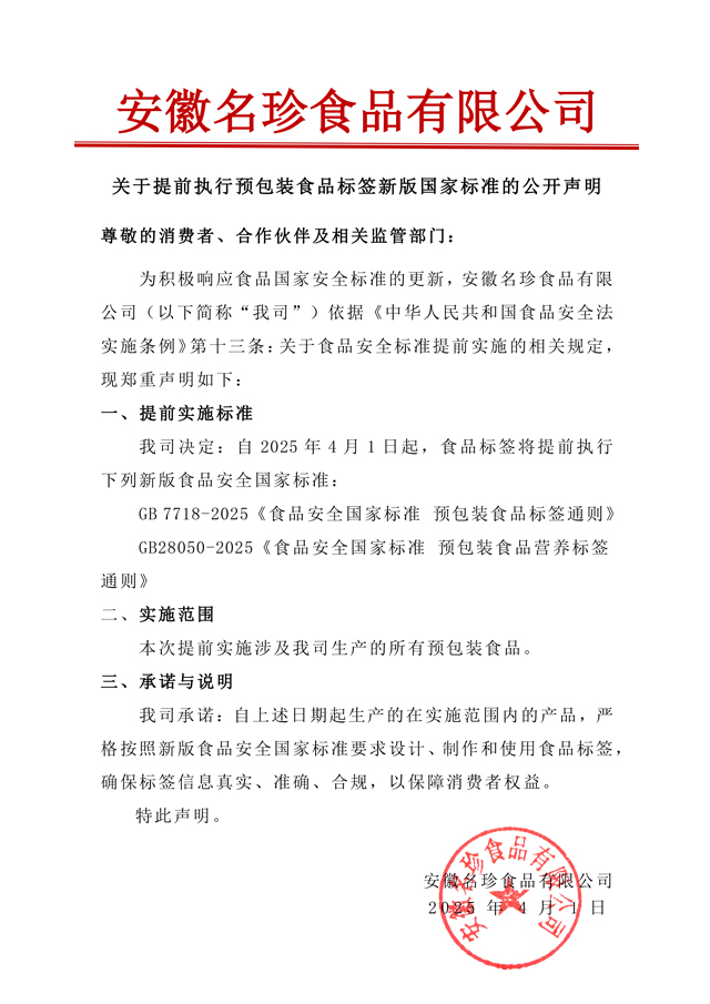 名珍食品关于提前执行预包装食品标签新版国家标准的公开声明